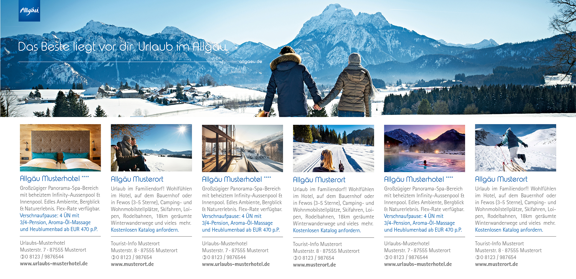 Der Jumbostreifen wird prominent im redaktionellen Umfeld des Reiseteils platziert – häufig direkt unter Artikeln oder auf der Titelseite – und präsentiert Ihr Angebot im einheitlichen Allgäu-Layout mit Text, Bild und Kontaktdaten. So wird Ihre Marke sichtbar, glaubwürdig und aufmerksamkeitsstark in Szene gesetzt.